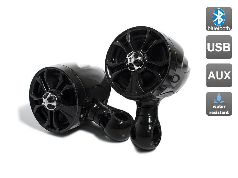 Аудиосистема MT185 для мотоцикла в прочном металлическом корпусе черного цвета с влагозащитой IP65. Встроенный усилитель 2x100 Вт и 4” динамики. Аудиосистема воспроизводит музыкальные файлы MP3/ WMA c USB носителей, также возможно подключение MP3-плеера, телефона и т.д. через AUX IN. Встроенный Bluetooth 3.0 для воспроизведения музыки со смартфона.