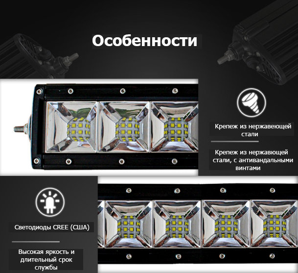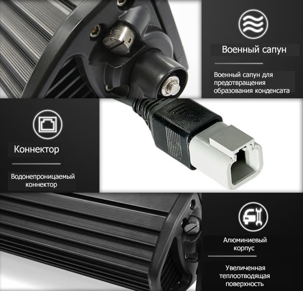 Благодаря своим характеристикам, качеству сборки и надежности, данная модель может быть установлена на различных видах техники: внедорожники, квадроциклы, багги, крупную промышленную и строительную технику, трактора, вездеходы, речные и морские суда и малую авиацию. Светодиодная балка AURORA имеет прямой по всей длине корпус, выполненный с интегрированным радиатором, обеспечивающим стабильный температурный режим работы. Для оптимального отвода тепла от фары на ее корпусе есть дополнительные насечки. В изделии установлены оригинальные светодиоды CREE производства США. Для предотвращения образования конденсата внутри корпуса при перепаде температур во время работы и после отключения. Светодиодная балка оснащена высокотехнологичным регулятором давления (сапун). Эта особенность кардинально отличает все изделия AURORA от других производителей этой товарной ниши. Данная LED фара AURORA так же снабжена крепежом из прочных материалов. Сама светодиодная балка, штекер и электрические провода выполнены с учетом защиты соединений от попадания пыли и влаги по стандарту IP69K.