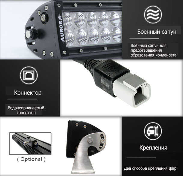 Представленная светодиодная балка AURORA комбинированного диапазона света (Combination, угол 10° + 20°). В изделиях этой серии светодиоды установлены в два ряда. Благодаря своим характеристикам, качеству сборки и надежности, данная модель может быть установлена на различных видах техники: внедорожники, квадроциклы, багги, крупную промышленную и строительную технику, трактора, вездеходы, речные и морские суда и малую авиацию. Светодиодная балка AURORA имеет прямой по всей длине корпус, выполненный с интегрированным радиатором, обеспечивающим стабильный температурный режим работы. Для оптимального отвода тепла от фары на ее корпусе есть дополнительные насечки. В изделии установлены оригинальные светодиоды CREE производства США. Для предотвращения образования конденсата внутри корпуса при перепаде температур во время работы и после отключения. Светодиодная балка оснащена высокотехнологичным регулятором давления (сапун). Эта особенность кардинально отличает все изделия AURORA от других производителей этой товарной ниши. Данная LED фара AURORA так же снабжена крепежом из прочных материалов. Сама светодиодная балка, штекер и электрические провода выполнены с учетом защиты соединений от попадания пыли и влаги по стандарту IP69.