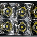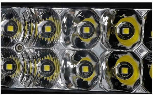 8 диодов с волнистыми рефлекторами, собранные в две группы по 4 диода на каждом торце создают поток света с углом в 20° - Flood - такой тип света не бьет так же далеко как Spot, но отлично освещает пространство по сторонам и обочины.