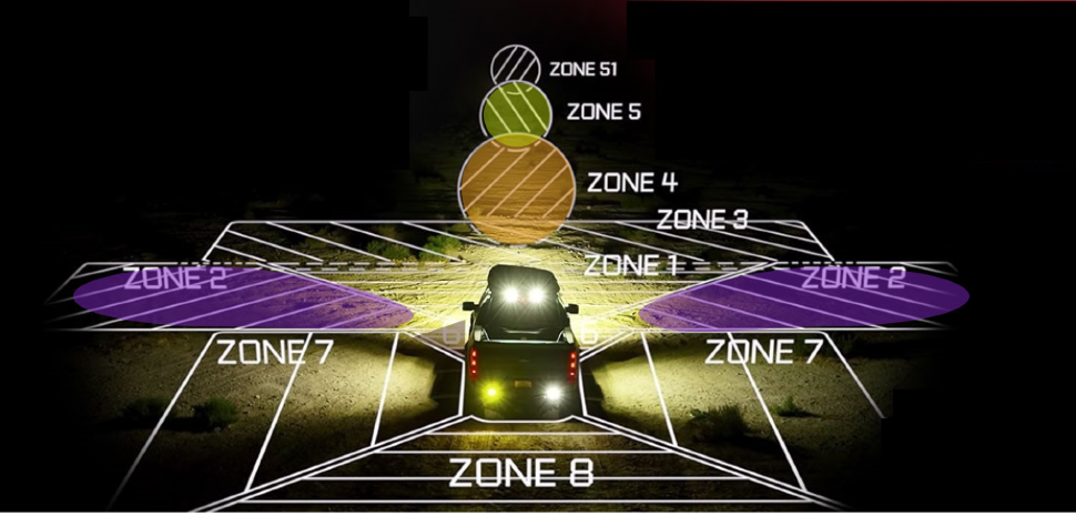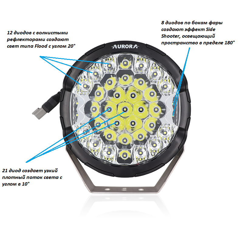 Светодиодная фара Aurora ALO-GR7-B одновременно создаёт 3 типа светового потока. 21 светодиод отвечают за тип света Spot - длинный узкий луч с углом в 10°, 12 светодиодов, по три с четырёх сторон, за тип света Flood - более широкий, с углом в 20°, дополнительные 8 диодов по бокам фары создают эффект Side Shooter - освещение области слева и справа от фары, с углом в 180°. Объединение типов света Spot + Flood в одной светодиодной фаре или балке называется Combination или Combo. Соединение Combo + Side Shooter отлично подходит для освещения не только пространства перед техникой, но и обочин.