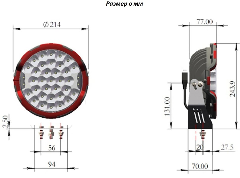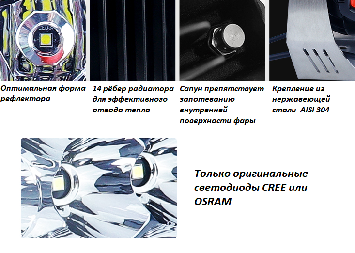 41 светодиод OSRAM суммарной мощностью 205W создают плотный поток света в 21300Lm длинной до 1150м и шириной до 9м.