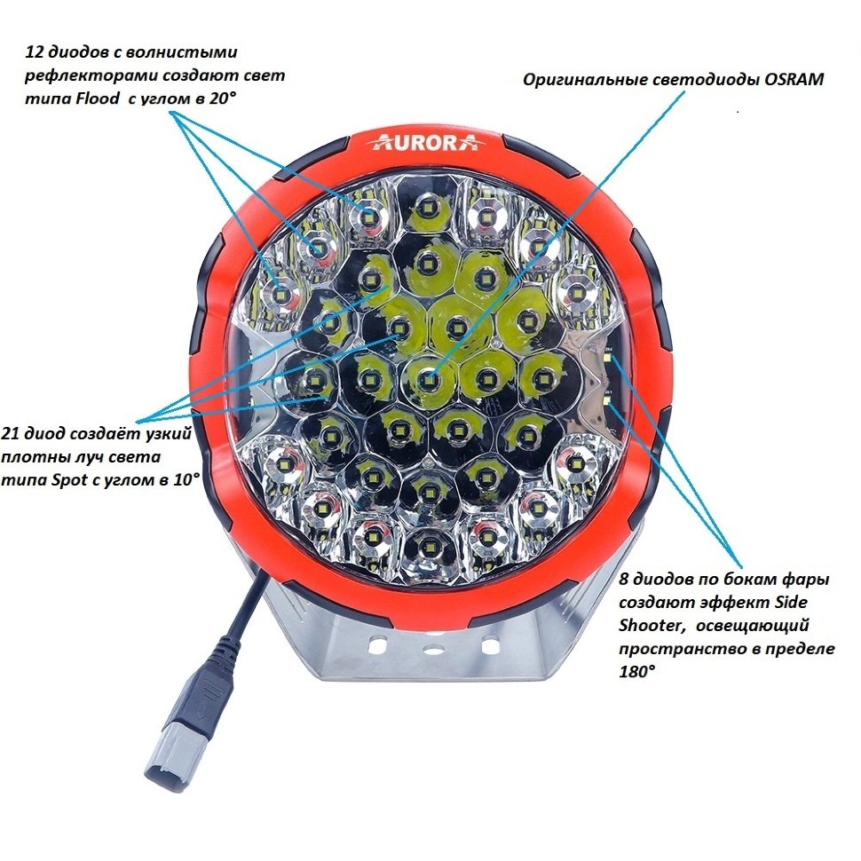 Светодиодная фара Aurora ALO-GR7-R одновременно создаёт 3 типа светового потока. 21 светодиод отвечают за тип света Spot - длинный узкий луч с углом в 10°, 12 светодиодов, по три с четырёх сторон, за тип света Flood - более широкий, с углом в 20°. Дополнительные 8 диодов по бокам фары создают эффект Side Shooter - освещение области слева и справа от фары, с углом в 180°. Объединение типов света Spot + Flood в одной светодиодной фаре или балке называется Combination или Combo. Соединение Combo + Side Shooter отлично подходит для освещения не только пространства перед техникой, но и обочин.