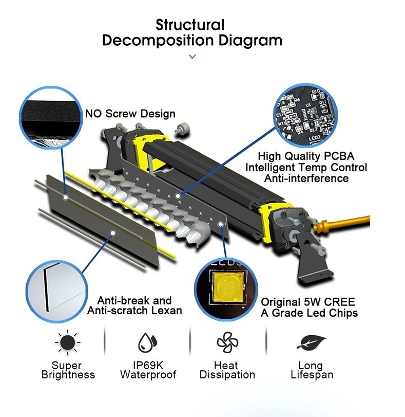 Представленная светодиодная балка AURORA комбинированного диапазона света (Combination, угол 10° + 20°). В изделиях этой серии светодиоды установлены в один ряд. Благодаря своим характеристикам, качеству сборки и надежности, данная модель может быть установлена на различных видах техники: внедорожники, квадроциклы, багги, крупную промышленную и строительную технику, трактора, вездеходы, речные и морские суда и малую авиацию. Светодиодная балка AURORA имеет прямой по всей длине корпус, выполненный с интегрированным радиатором, обеспечивающим стабильный температурный режим работы. Для оптимального отвода тепла от фары на ее корпусе есть дополнительные насечки. В изделии установлены оригинальные светодиоды OSRAM производства Германии. Для предотвращения образования конденсата внутри корпуса при перепаде температур во время работы и после отключения, светодиодная балка оснащена высокотехнологичным регулятором давления (сапун). Эта особенность кардинально отличает все изделия AURORA от других производителей этой товарной ниши. Данная LED фара AURORA так же снабжена крепежом из прочных материалов. Сама светодиодная балка, штекер и электрические провода выполнены с учетом защиты соединений от попадания пыли и влаги по стандарту IP69.