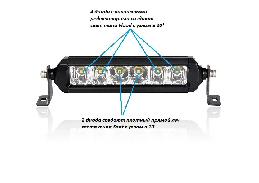 Светодиодная балка Aurora (Аврора) ALO-S5-6 создаёт 2 типа освещения. 2 диода в центре создают плотный узкий луч света - Spot с углом в 10°. 4 диода, по два с каждой стороны заключены в волнистые рефлекторы и создают поток света по типу Flood с углом в 20°.