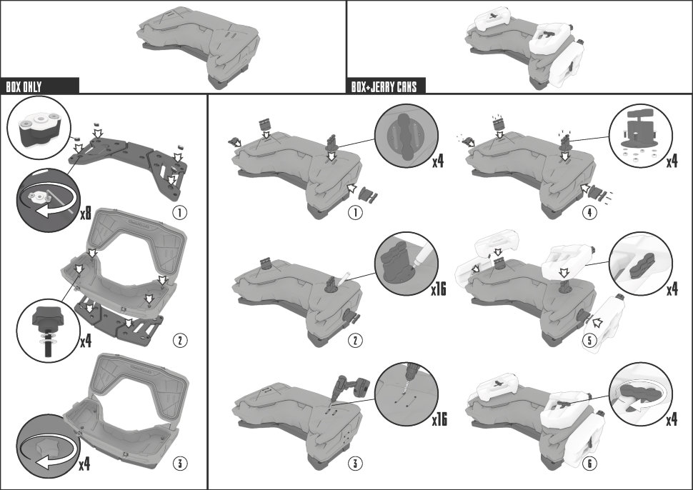 Кофр комплектуется быстросъемными креплениями, которые устанавливаются в штатные отверстия, предусмотренные на багажной решетке, поэтому первая установка кофра не займет более 10 минут, а затем его можно будет при необходимости снимать или ставить буквально в течение 1 минуты! Надежные металлические замки запираются на ключ, обеспечивая сохранность ваших вещей. Уплотнительная резинка на крышке кофра защитит вещи от попадания влаги, грязи и пыли даже в самых тяжелых условиях эксплуатации.