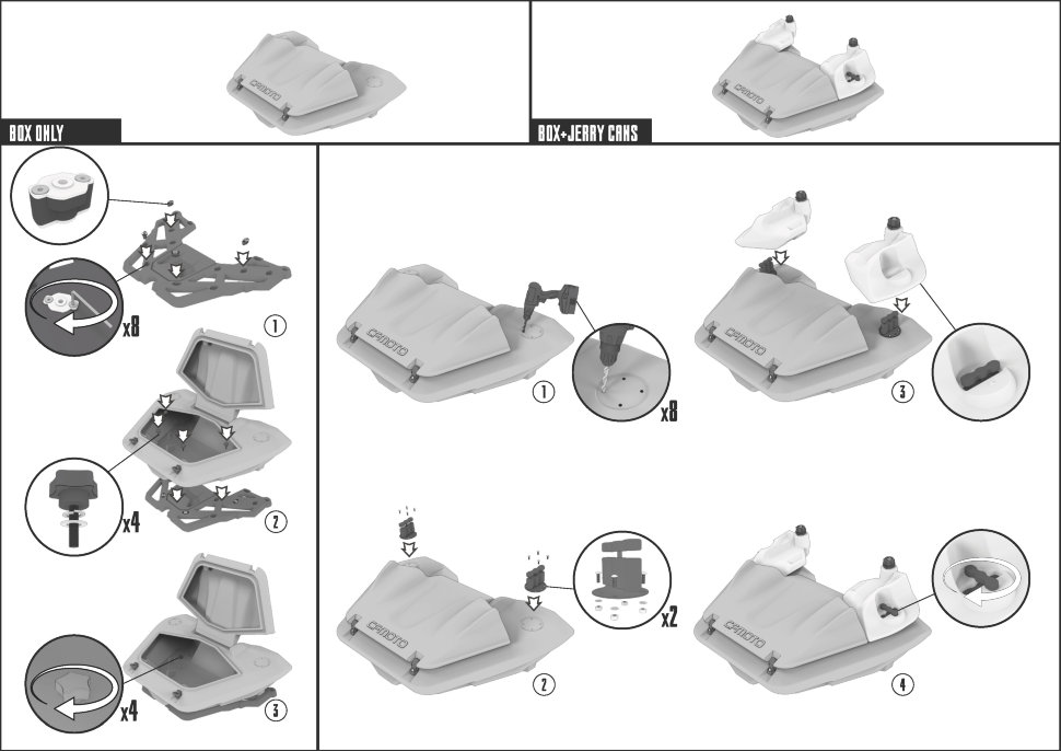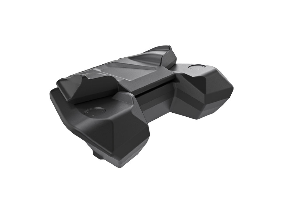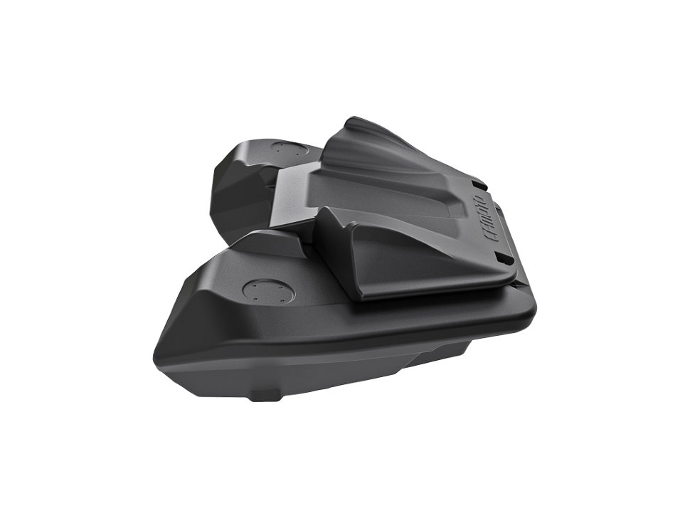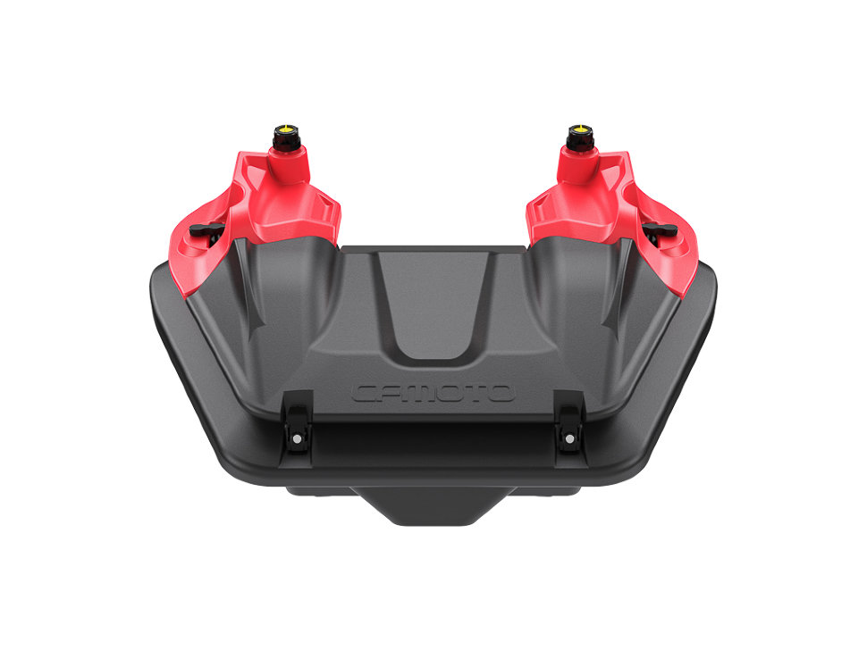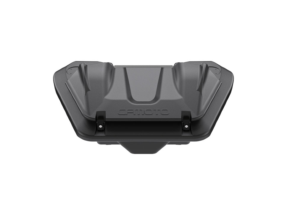На крышке кофра специальная площадка для установки двух оригинальных 5-ти литровых канистр CFMOTO. Формовочные усиленные петли с легкостью выдерживают вес массивной крышки и двух канистр на ней.За счет многочисленных ребер жесткости, создающих футуристический дизайн, кофр из армированного полиэтилена имеет небывалую прочность!