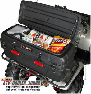 Кофр для снаряжения KOLPIN ATV Cooler Trunk - это отличный способ взять в поездку холодные напитки и даже лед, а также сухой груз в одном инновационном багажнике для квадроцикла. Багажный короб состоит из двух разделов - верхний сухой отсек для одежды, инструмента или продуктов, и нижний отсек холодильника для льда, напитков и многого другого. Верхний отсек обеспечивает объем 28.3 литра. В открытом состоянии крышка отсека удерживается двумя стальными тросиками. Нижняя часть представляет собой утепленный пеной отсек объемом 35 литров, в котором есть сливная пробка и два газовых вспомогательных поршня для легкого доступа. Две литые ручки делают этот багажный короб для квадроцикла легким в переноске, в то время как два задних отражателя обеспечивают видимость квадроцикла в темное время. Кофр разработан специально для тяжелых условий эксплуатации из УФ-стабилизированного полиэтилена и может быть установлен на большинство трубчатых или композитных стоек с помощью входящего в комплект крепежа.