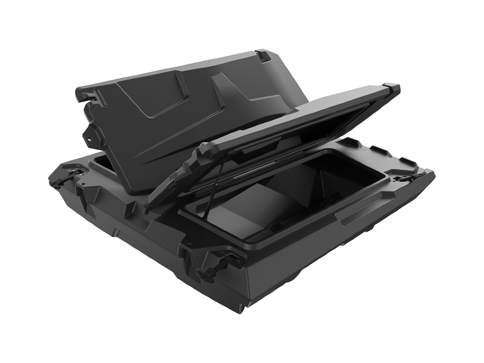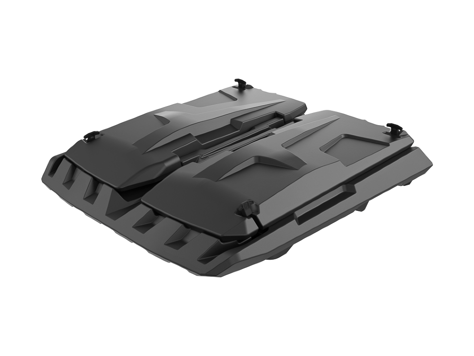 Багажник прикреплен к раме багги. Кейс состоит из двух отделений; у каждого из них есть откидная створка с подставкой.