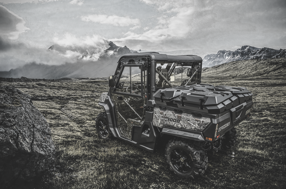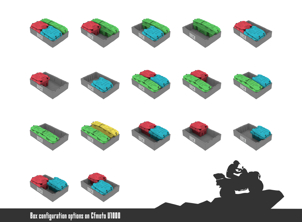 Комплект модульных кофров для мотовездехода Cfmoto U1000 состоит из двух моделей: квадратной и вытянутой прямоугольной формы.