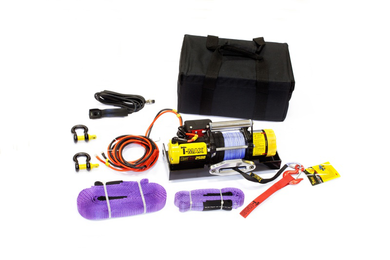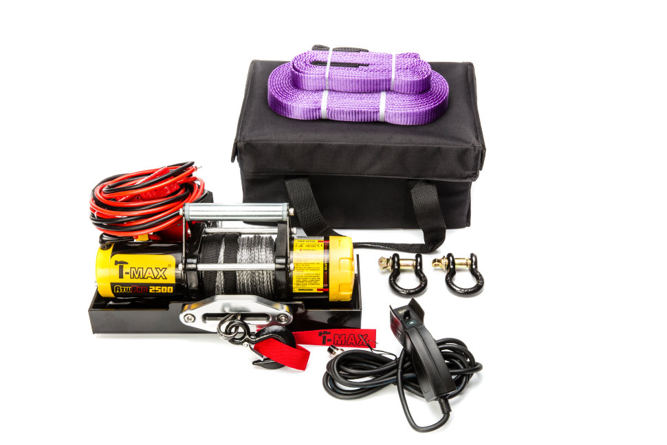 Переносная лебедка — универсальный помощник для владельца квадроцикла, снегохода или легкового автомобиля. Комплект оборудования умещается в компактной сумке, весит около 15 кг и не требует стационарной установки на транспортное средство, что снимает вопросы с сертификацией и переоформлением. При этом приводится в готовность к работе за считанные минуты. В основе комплекта — отлично зарекомендовавшая себя модель T-Max ATW PRO 2500, развивающая тяговое усилие в 1,1 тонны, которое удваивается при использовании блока усиления. Комплектуется легким и прочным синтетическим тросом.