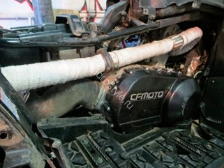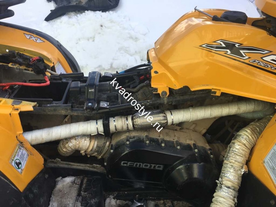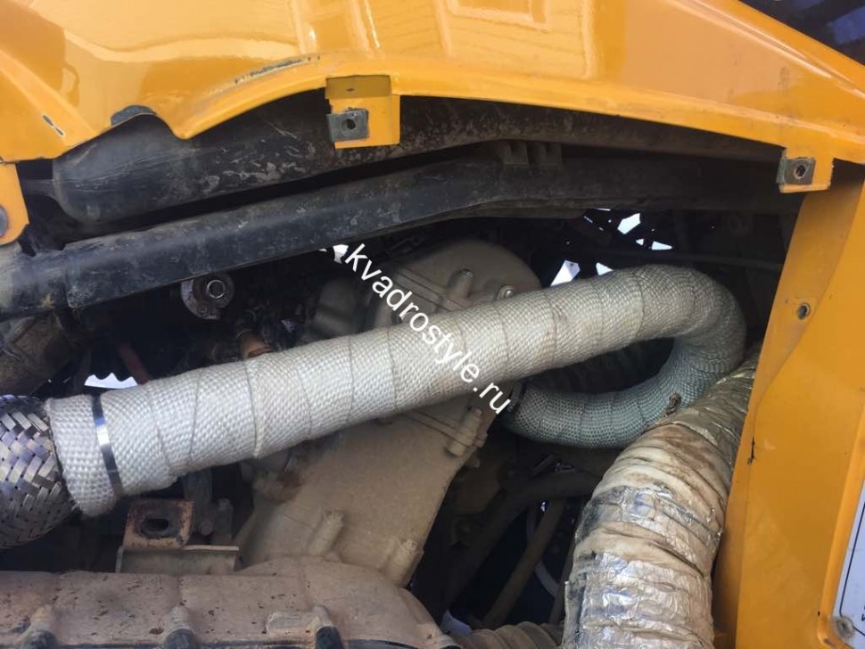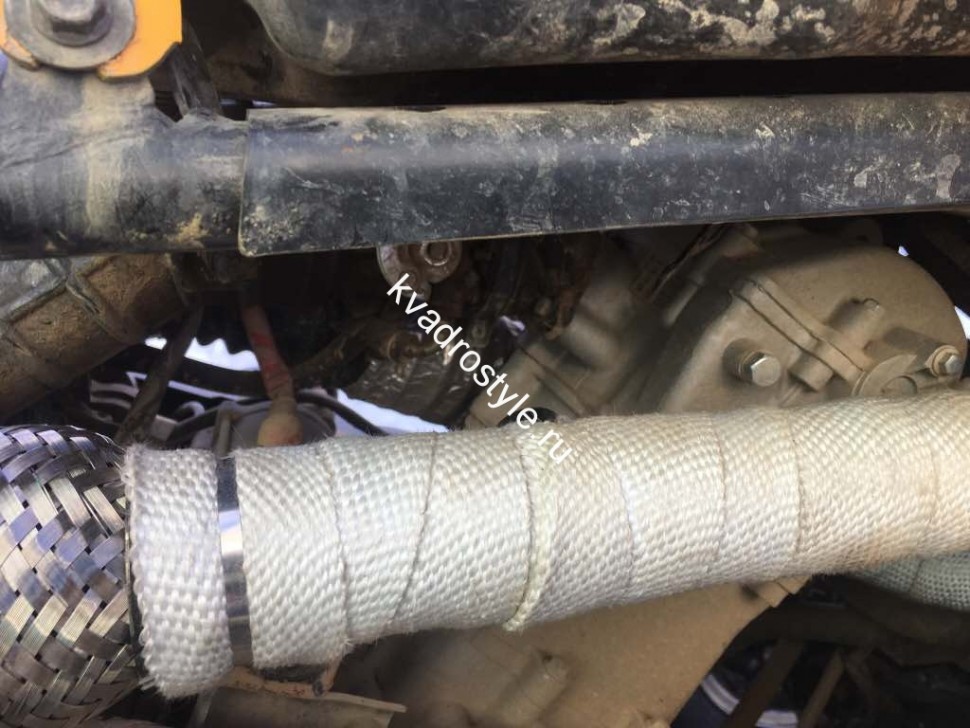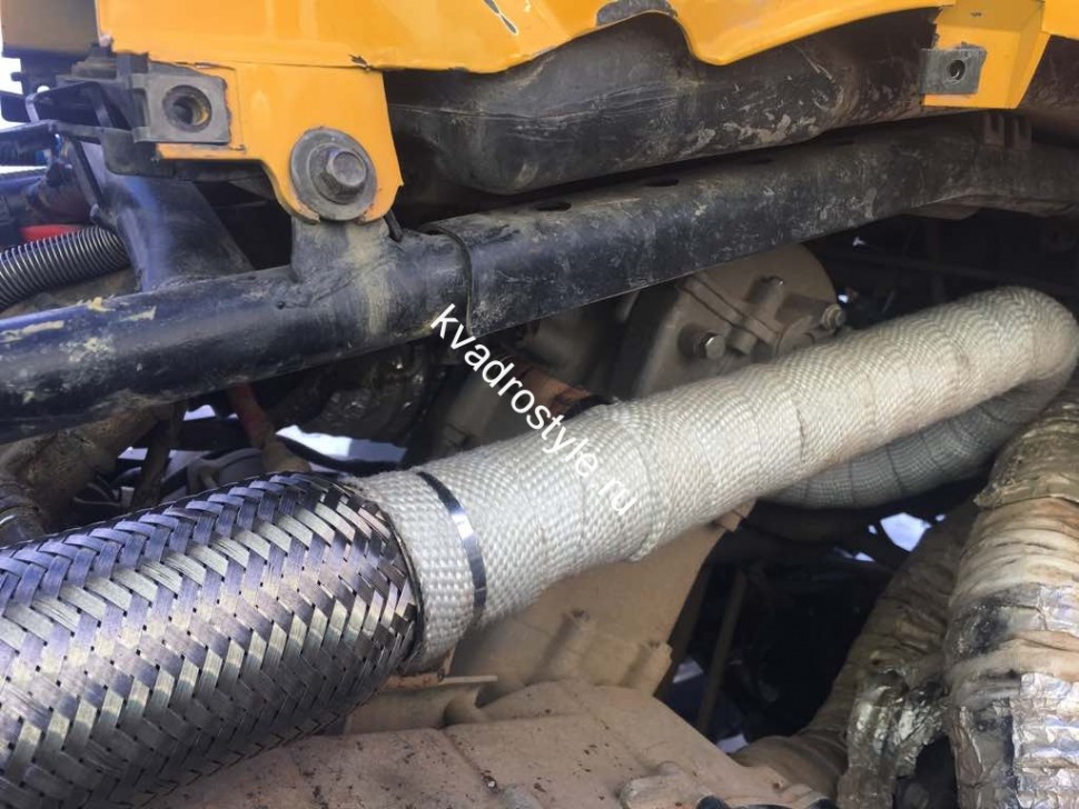 Выхлоп собран на 50мм нержавеющей трубе, в конце устанавливается глушитель фирмы FOX racing изготовляемые на заказ, весь тракт проходит теплоизоляцию термолентой Buddyclub 1300 или Super Termo которая снижает температуру трассы до приемлемой и делает передвижение на квадроцикле более комфортное.