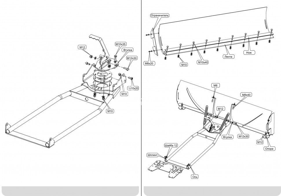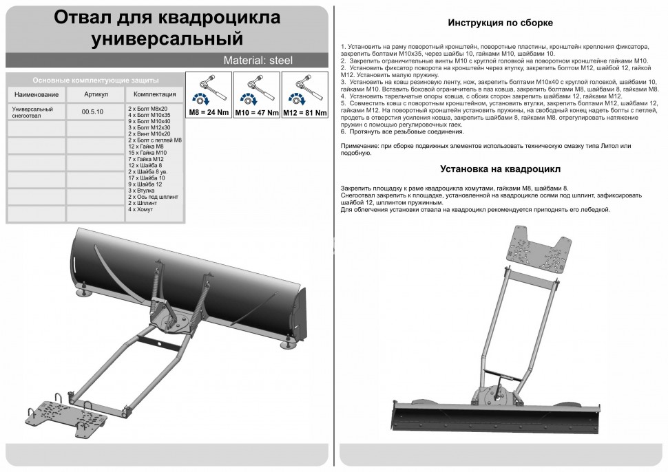 В комплектацию элемента входит специальная рукоять, поворачивающая отвал. Она оснащена возвратным механизмом. Рама имеет высокую степень прочности. Деталь полностью совместима с большинством моделей мотовездеходов известных производителей, относится к категории универсальных.