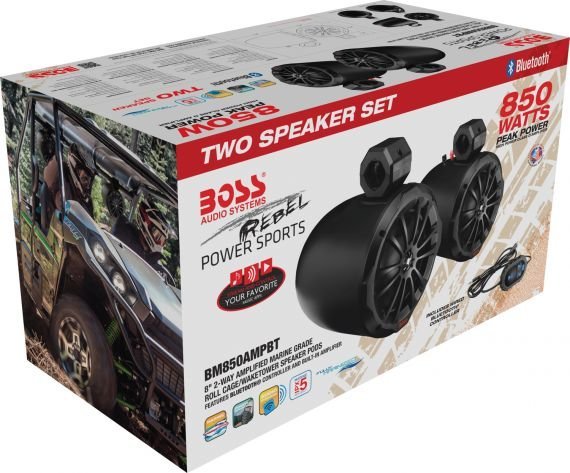 Готовая система для машинок класса UTV и квадроциклов представляет собой 2 активных динамика со встроенным усилителем 850Вт и пульт управления с креплением на руль и модулем Bluetooth.